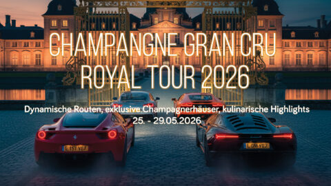 Erleben Sie von 25.05. bis 29.05.2026 eine unvergessliche Sportwagen-Tour in die Champagne: Dynamische Routen, exklusive Champagnerhäuser, kulinarische Highlights und...
